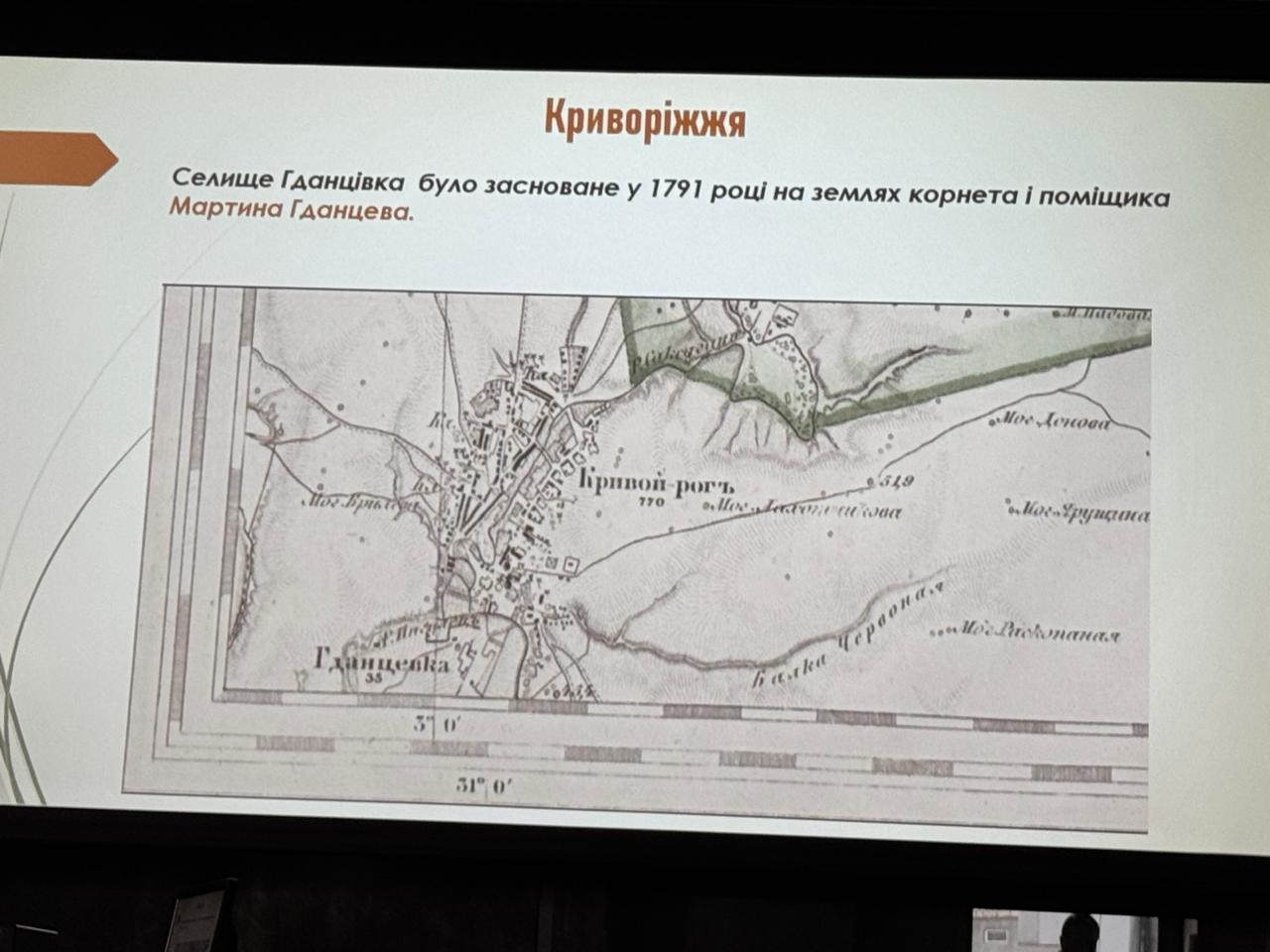 Лекція була насичена унікальними історичними матеріалами: старовинними мапами, архівними даними та рідкісними світлинами. Ми дізналися, як ще у 1791 році на землях корнета Мартина Гданцева було засноване селище Гданцівка — майбутня частина промислового Криворіжжя. Побачили плани Старого і Нового Кодака, а також детальні карти Криворіжжя з позначенням річок і балок, які формували ландшафт регіону.